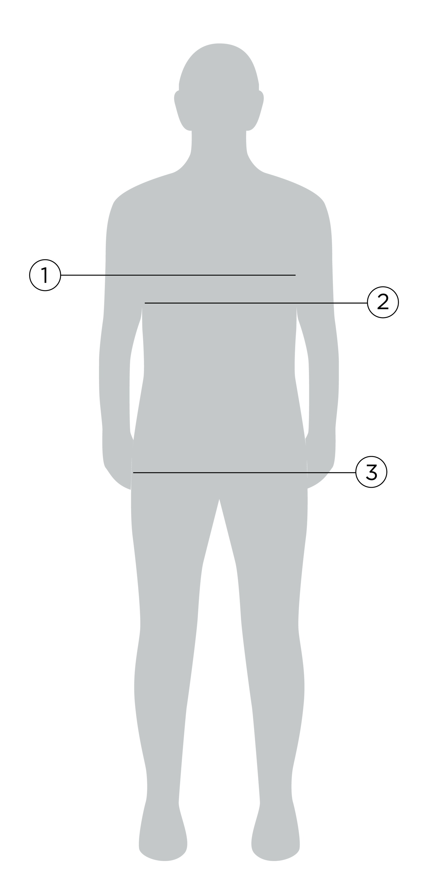 Beim Messen deines Hüftumfangs (3) misst du an der breitesten Stelle. Stell sicher, dass dein Maßband gerade verläuft.